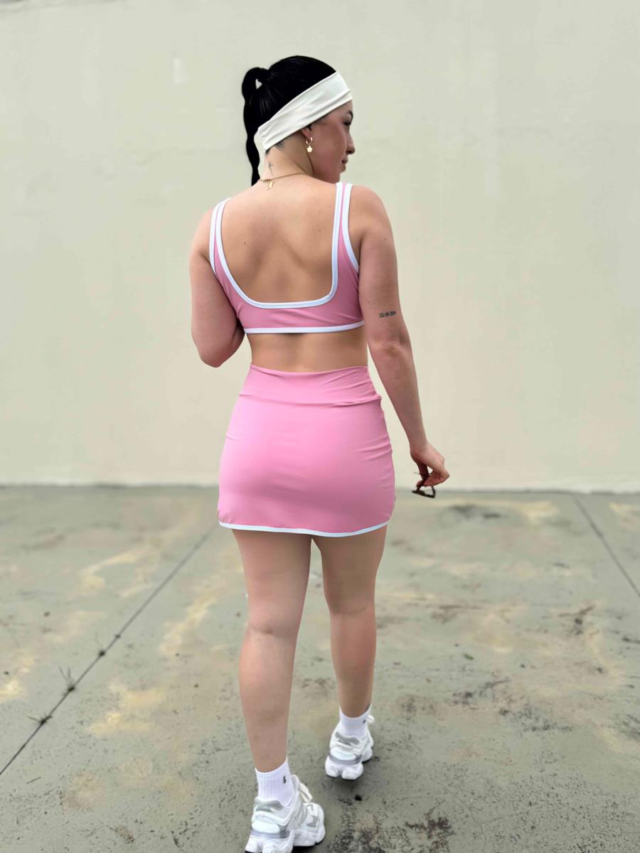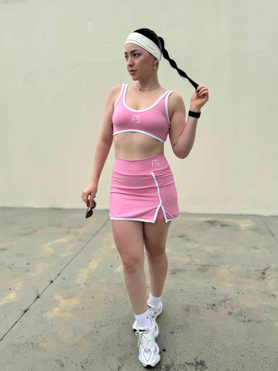 O short saia luna possui cintura alta, o cós duplo que deixa a peça firme na cintura, e uma fenda sutil e charmosa na parte frontal. O detalhe em viés branco traz um toque de delicadeza a peça. Modelagem confortável para treinar cheia de estilo.